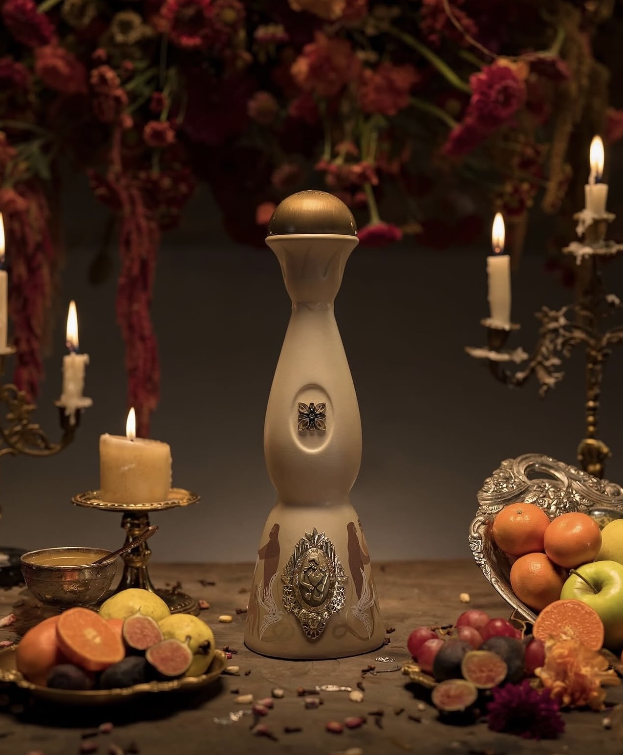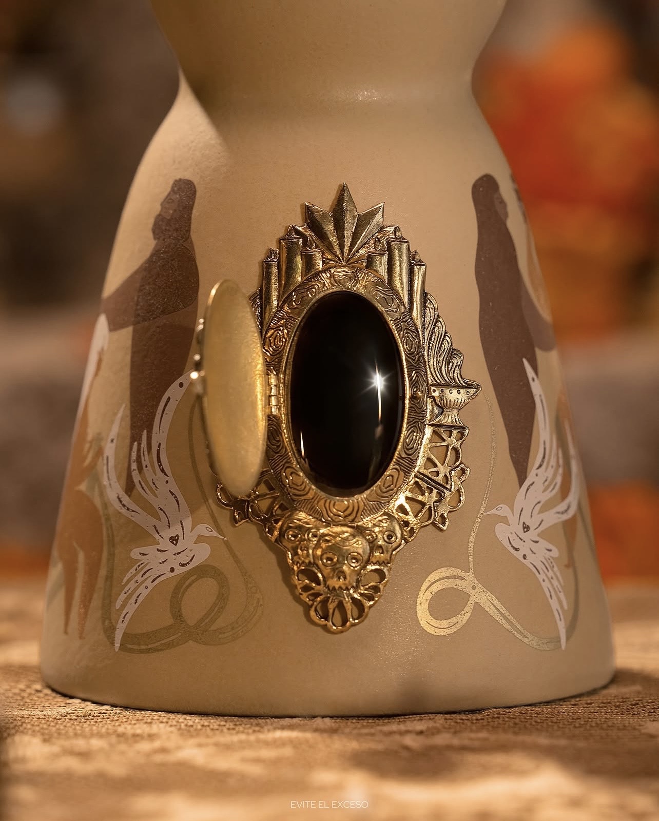 L’ornement à la base de la carafe, un médaillon en laiton plaqué or 24 carats, s’ouvre pour révéler un camée d’obsidienne, symbole du souvenir éternel. Son visage est orné de milagritos finement sculptés en bas-relief, encadrés de motifs traditionnels du Jour des Morts.